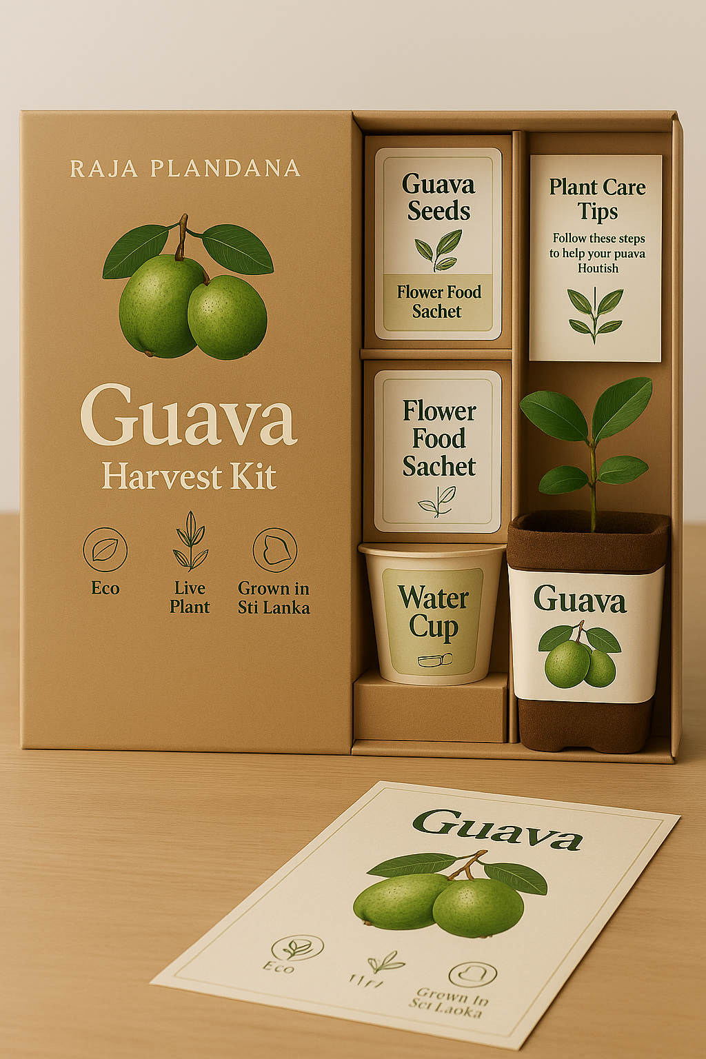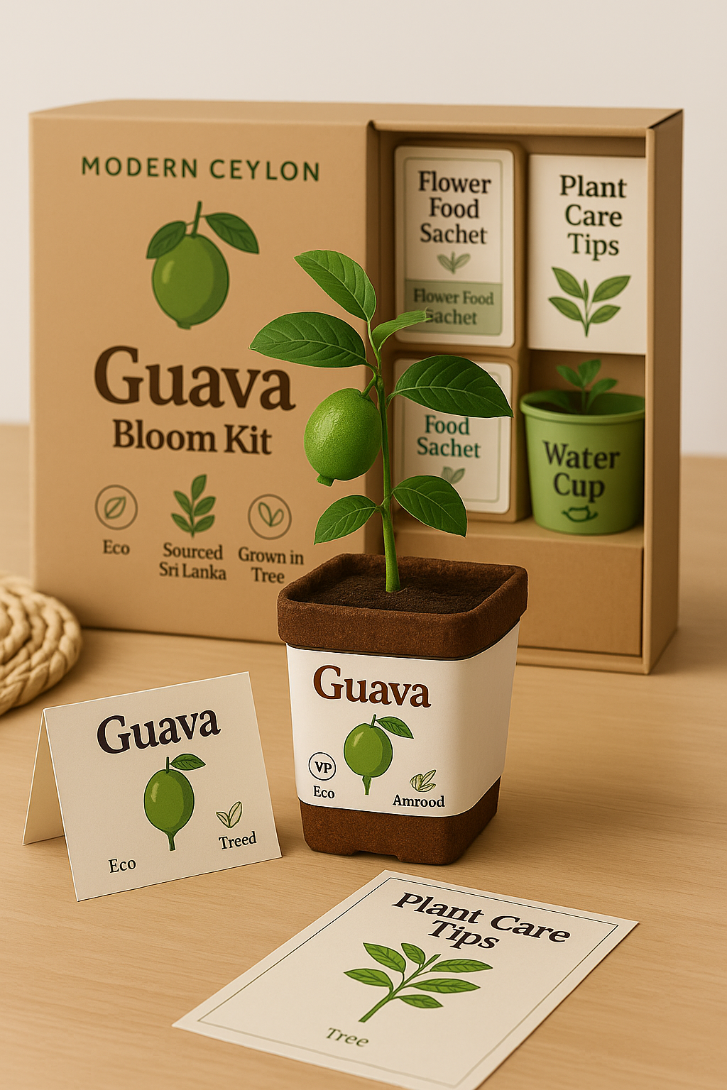 The Modern Ceylon Guava Harvest Kit brings the tropical delight of guava right to your windowsill or garden. This premium gift box includes a live guava plant grown in Sri Lanka, with organic flower food sachets, a watering cup, and easy plant care tips – all packed in a luxurious eco-friendly kraft box.