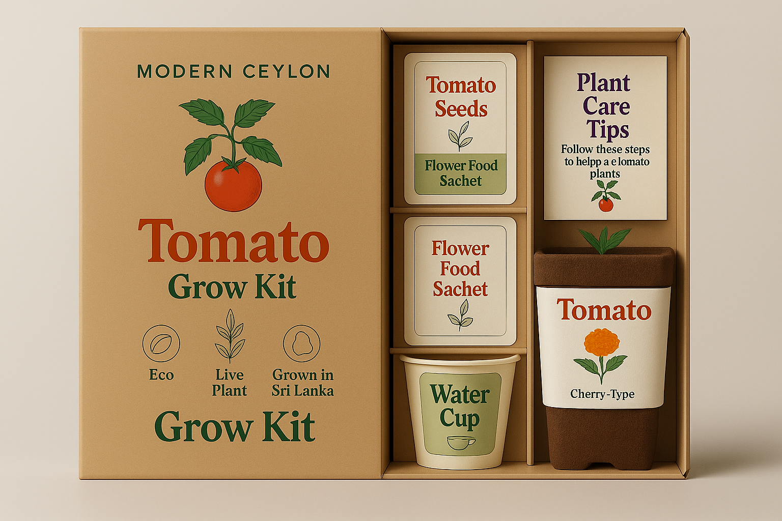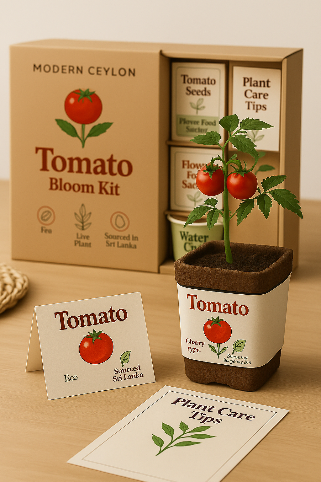 Grow your own juicy and sweet cherry tomatoes right at home with the Tomato Cherry-type Bloom Kit by Modern Ceylon. This all-in-one eco-friendly gift box includes everything you need to start your own tomato garden – perfect for windowsills, balconies, and small spaces.